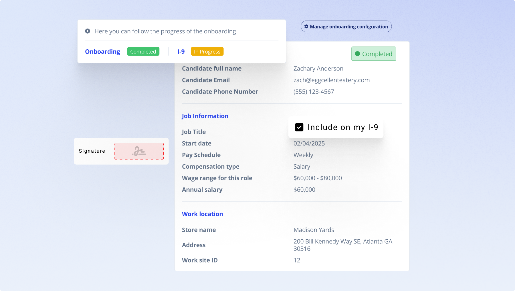 Real-time status tracking keeps hiring managers in the loop without the administrative burden, while automated reminders ensure nothing falls through the cracks. The experience is fully compliant and mobile-friendly, empowering employees to complete their onboarding process in minutes and days, not weeks.